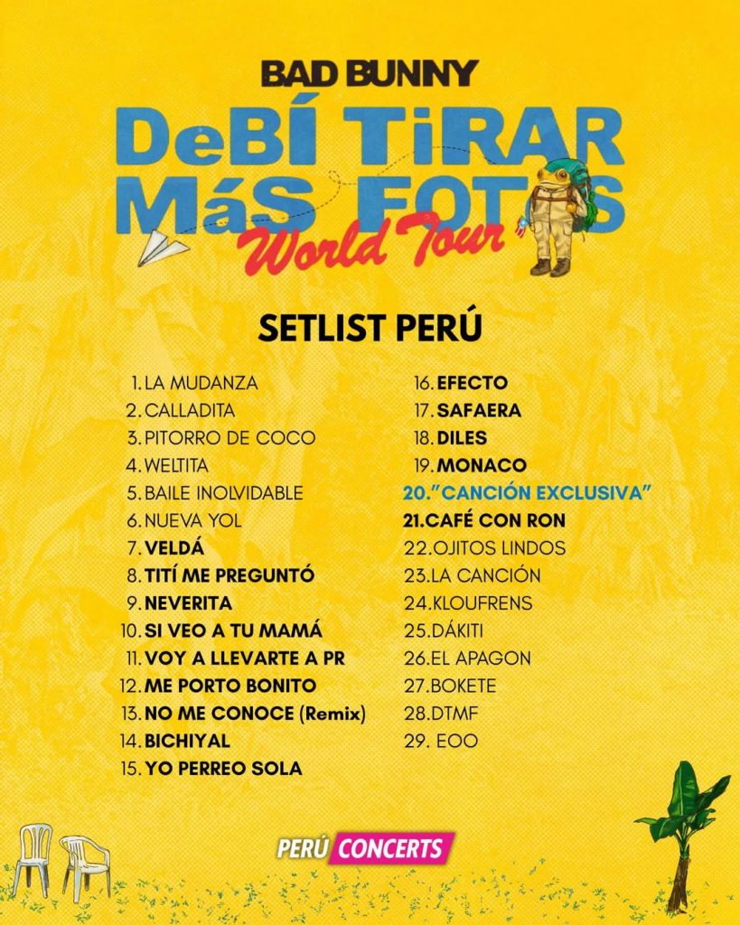 El listado de temas que Bad Bunny interpretaría en Perú se viralizó rápidamente en plataformas digitales, generando entusiasmo entre los fanáticos que asistirán a los conciertos, los cuales iniciarían aproximadamente a las 9:00 p.m. Estas son las canciones que formarían parte del espectáculo: